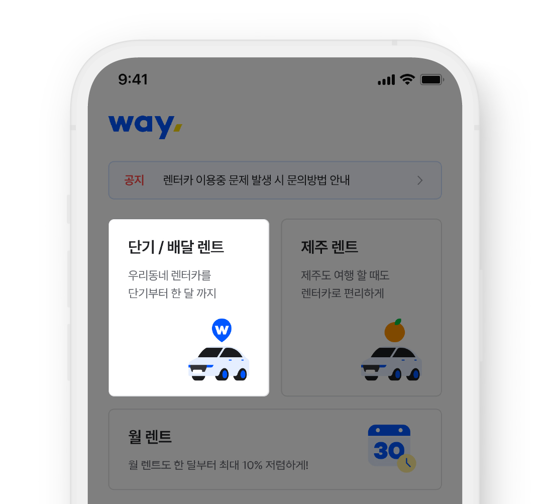 ① 웨이 앱 홈 화면에서 ‘단기/배달 렌트’를 선택해주세요.